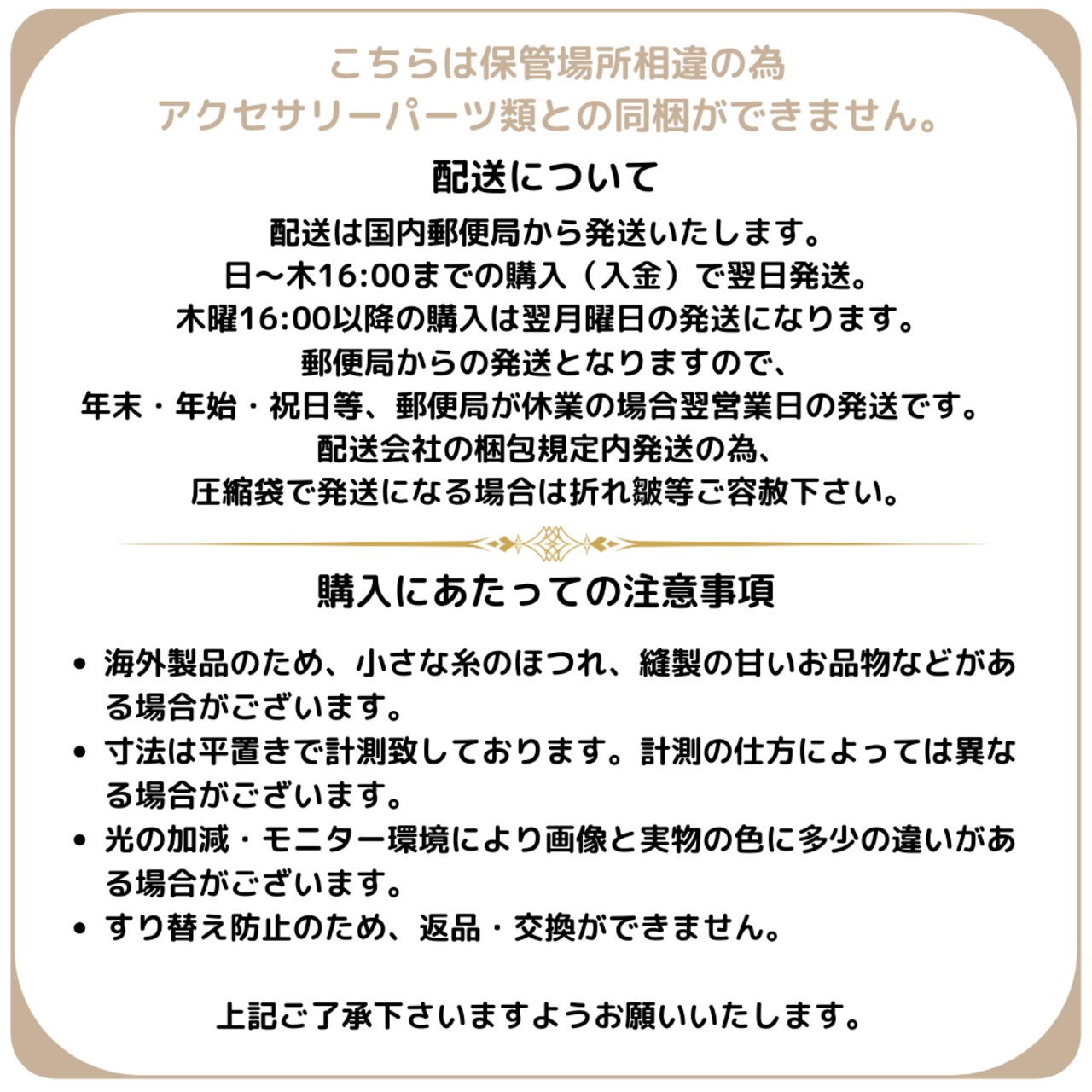 ・空気清浄機完備の倉庫にて一括保管の為アクセサリーパーツ類との同梱はできません。