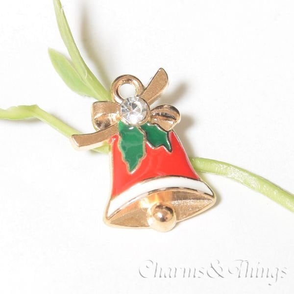 赤いエナメル加工に柊の葉を添えたのクリスマスベルのモチーフのチャーム、クリスマスのアクセサリーやオーナメントに!