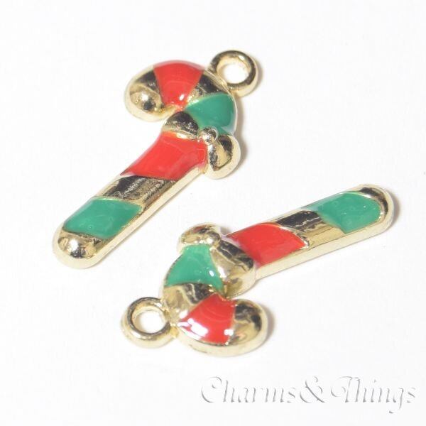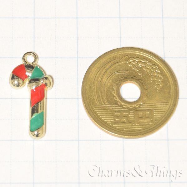 ゴールドとクリスマスカラーのキャンディースティックのチャーム。